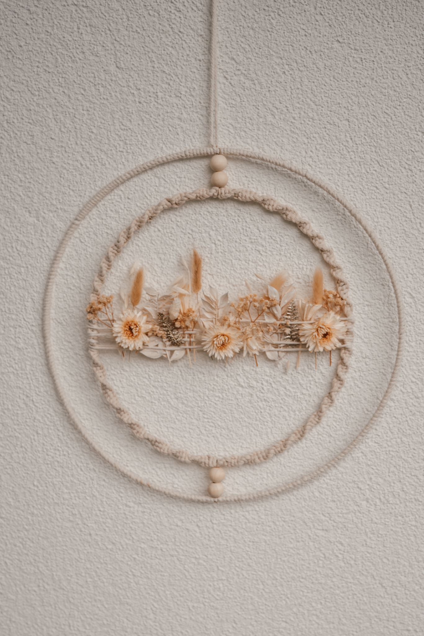 Liebevoll handgefertigter Makrameekranz mit Trockenblumen im „Boho-Look“.