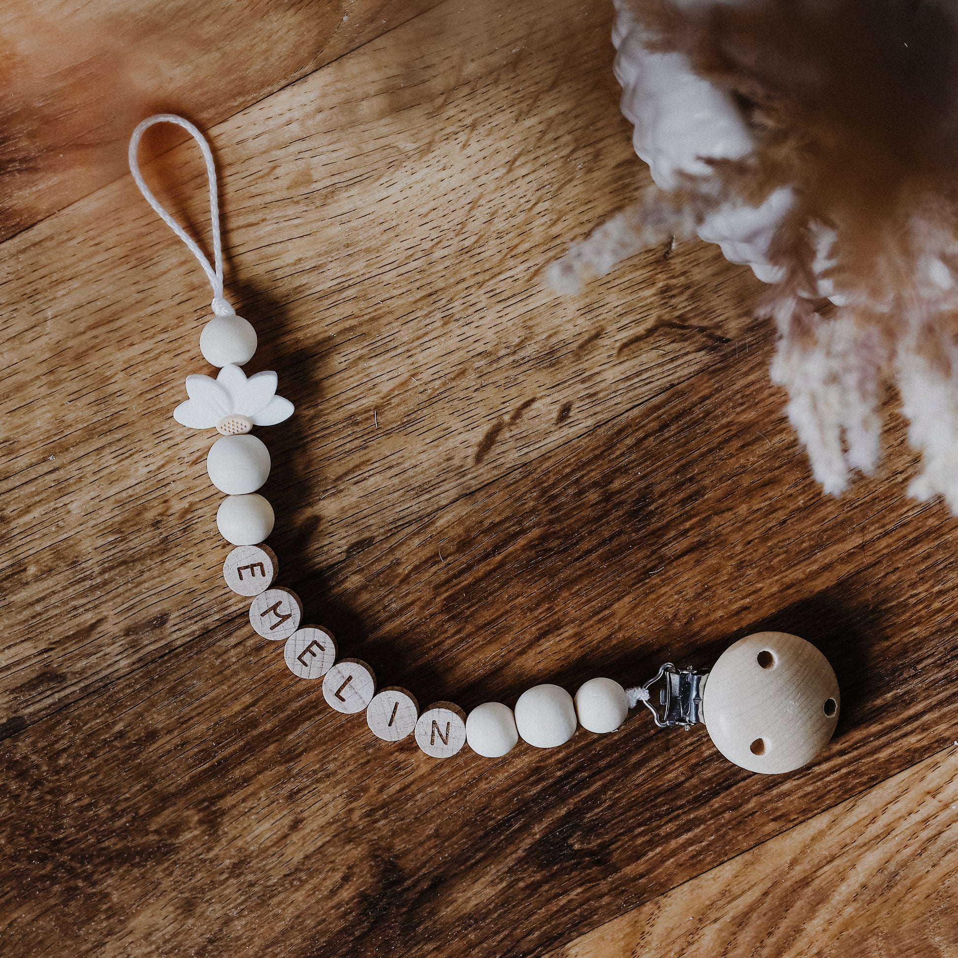 Eine besondere Mädchenhafte Schnullerkette 🌼 in Naturfarben, die mit deinem Wunsch Namen personalisiert wird. Die genaue Anordnung und Anzahl der Perlen richtet sich nach der Länge des Namens.